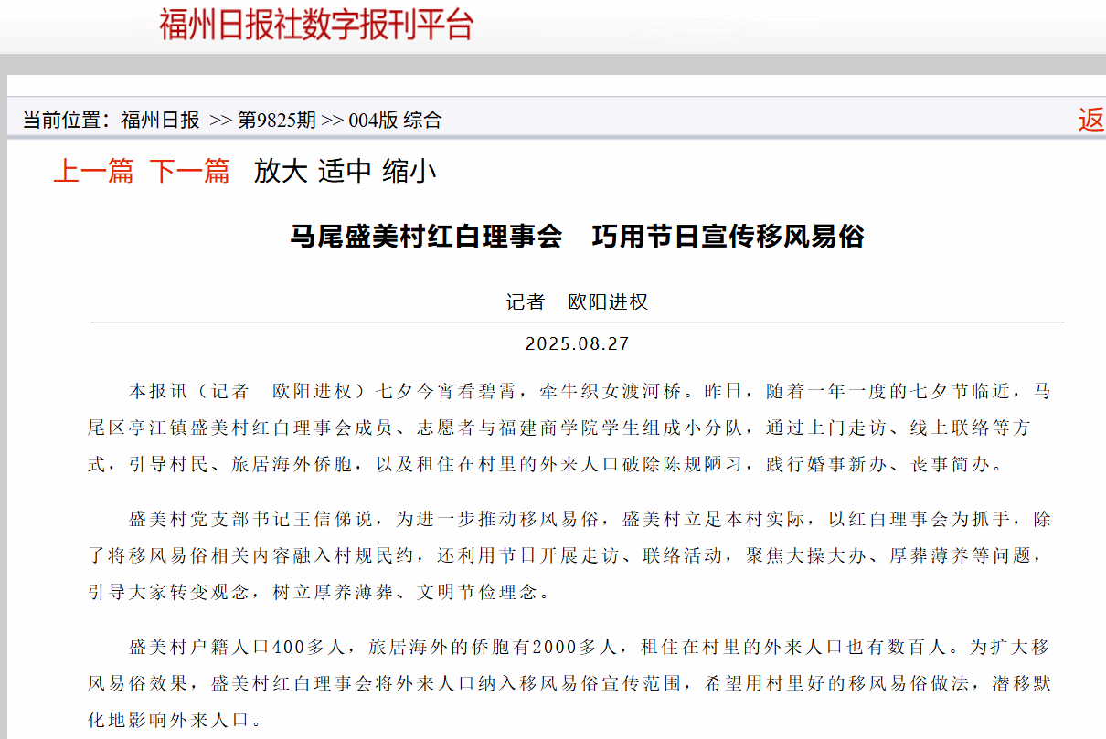编者按:近日,必赢官网学生积极参与马尾区亭江镇盛美村举办的活动,通过上门走访、线上联络等方式,引导村民、旅居海外侨胞,以及租住在村里的外来人口破除陈规陋习,践行婚事新办、丧事简办。相关报道转载如下。原文:七夕今宵看碧霄,牵牛织女渡河桥。26日,随着一年一度的七夕节临近,马尾区亭江镇盛美村红白理事会成员、志愿者与必赢国际437官网学生组成小分队,通过上门走访、线上联络等方式,引导村民、旅居海外侨胞,以及租住在村里的外来人口破除陈规陋习,...