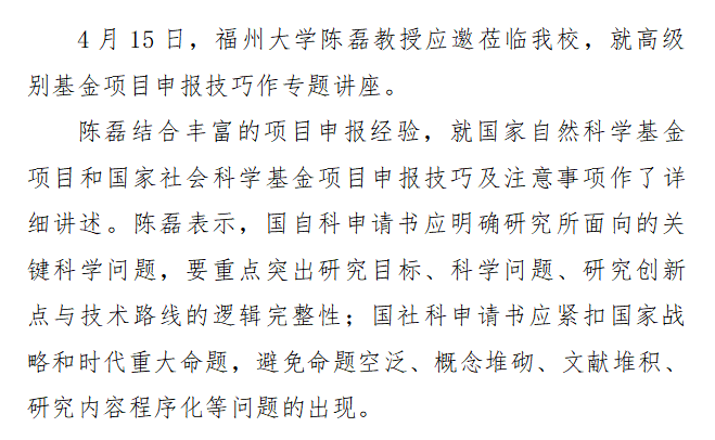 4月15日,福州大学陈磊教授应邀莅临必赢官网,就高级别基金项目申报技巧作专题讲座。陈磊结合丰富的项目申报经验,就国家自然科学基金项目和国家社会科学基金项目申报技巧及注意事项作了详细讲述。陈磊表示,国自科申请书应明确研究所面向的关键科学问题,要重点突出研究目标、科学问题、研究创新点与技术路线的逻辑完整性;国社科申请书应紧扣国家战略和时代重大命题,避免命题空泛、概念堆砌、文献堆积、研究内容程序化等问题的出现。...
