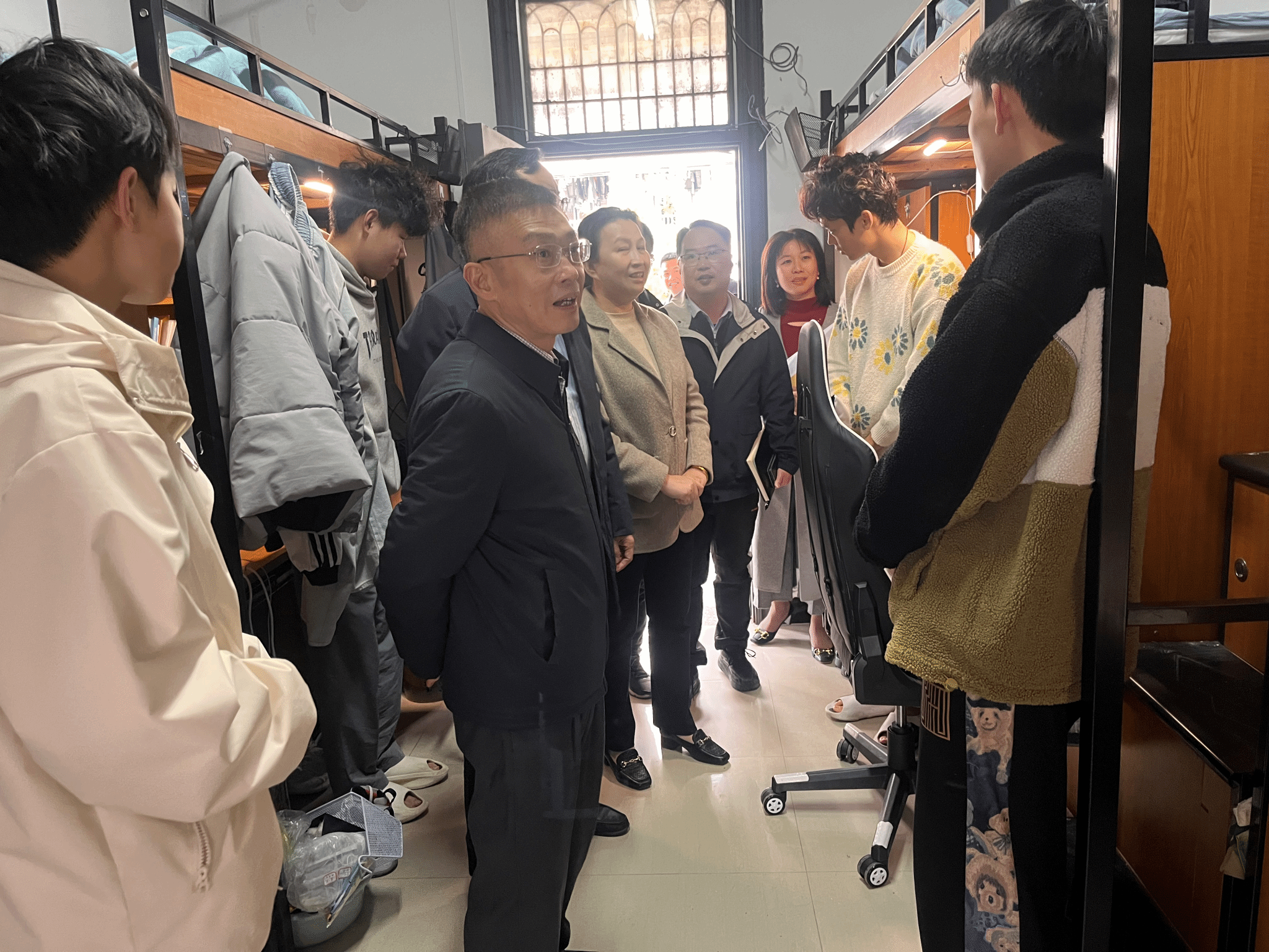 吴访益还带领与会同志到学生宿舍和自习室实地调研,并与在场学生深入交流。与会人员针对学生社区的人员管理、场地使用、安全建设等相关工作进行了研讨。