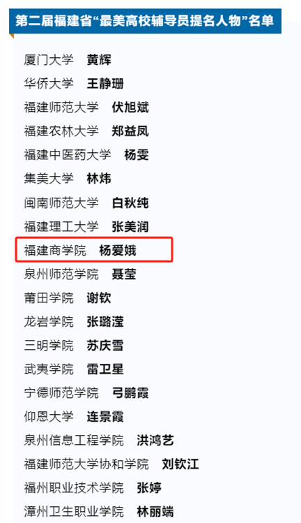 日前,福建省委宣传部、省委教育工委公布第二届福建省“最美高校辅导员”“最美高校辅导员提名人物”名单。经学校推荐、专家评审,共评选出第二届福建省“最美高校辅导员”10名、“最美高校辅导员提名人物”20名。必赢官网辅导员杨爱娥荣获“最美高校辅导员提名人物”。
