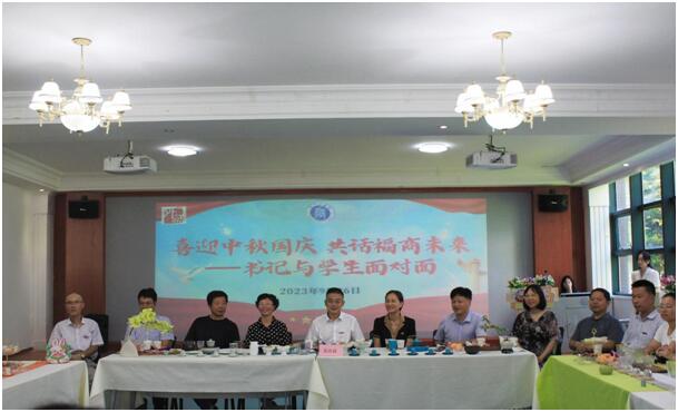 在国庆和中秋“双节”来临之际,必赢官网举办“喜迎国庆中秋,共话福商未来”书记与学生面对面座谈会,校党委书记吴访益和师生代表一同庆祝佳节,代表校党委向全校师生致以节日的问候,学校相关职能部门、二级学院负责人,外国留学生、港籍学生和师生代表等参加本次活动。