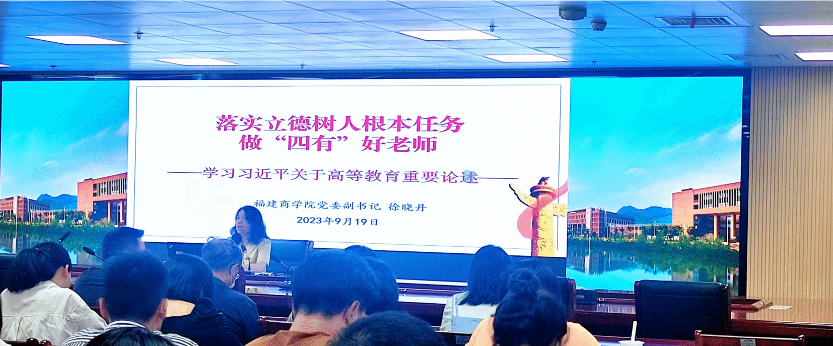 9月19日下午,必赢官网在连江校区举办新教师培训开班仪式暨“开班第一讲”活动,校党委副书记徐晓丹以《落实立德树人根本任务,做“四有”好老师 ——学习习近平总书记关于高等教育重要论述》为题为新教师讲授“第一课”,全体新入职教师、转岗教师参加开班仪式。