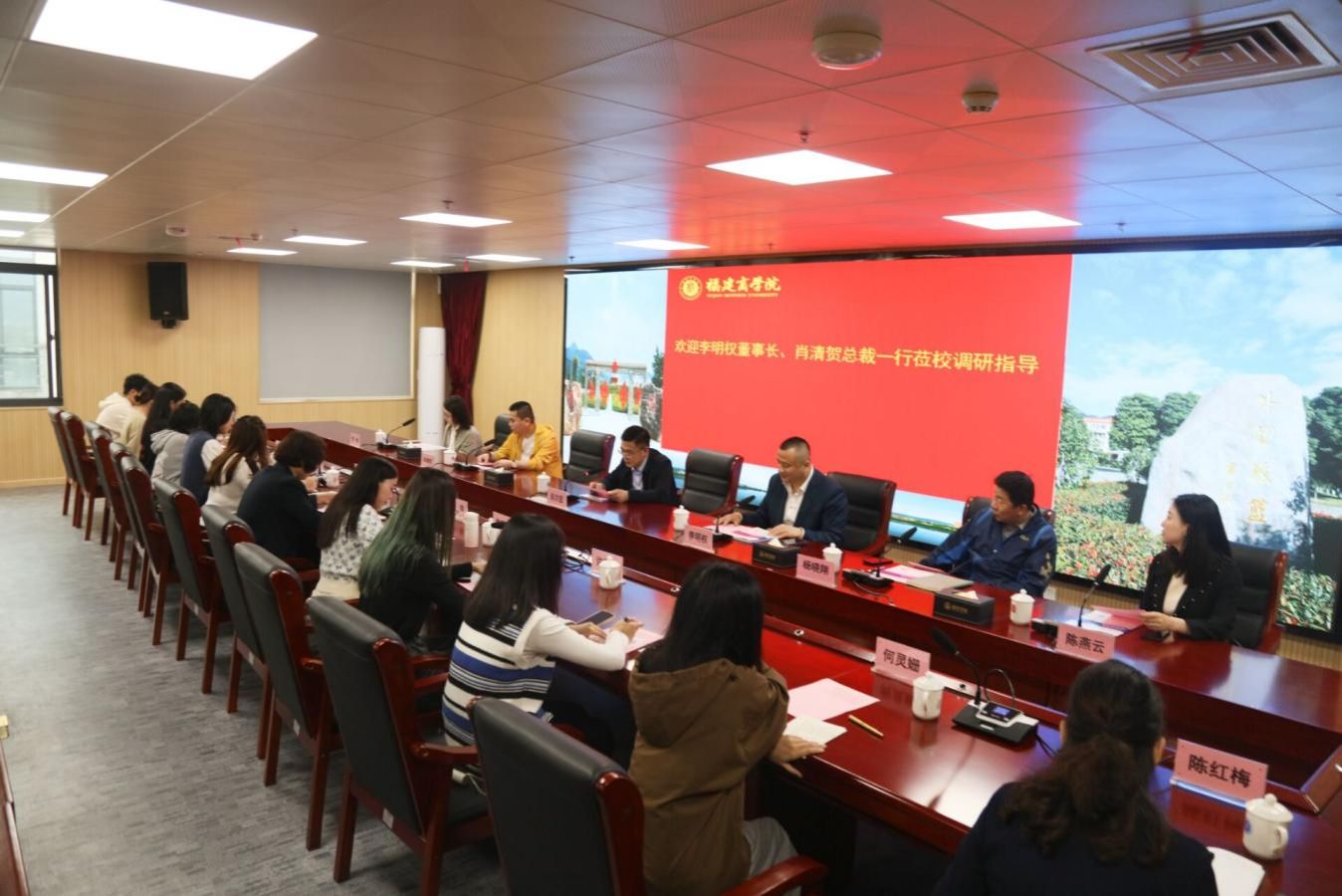 4月21日上午,福建爱德马运动饮料集团有限公司董事长李明权、总裁肖清贺一行莅临必赢官网调研指导习近平新时代中国特色社会主义思想学生读书社、教职工读书社等情况。校党委书记吴访益、副校长杨晓翔及读书社师生代表出席调研座谈会。