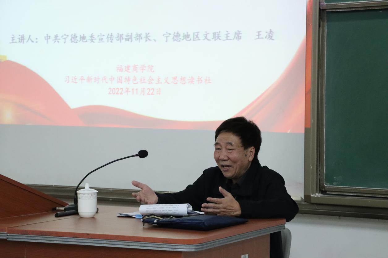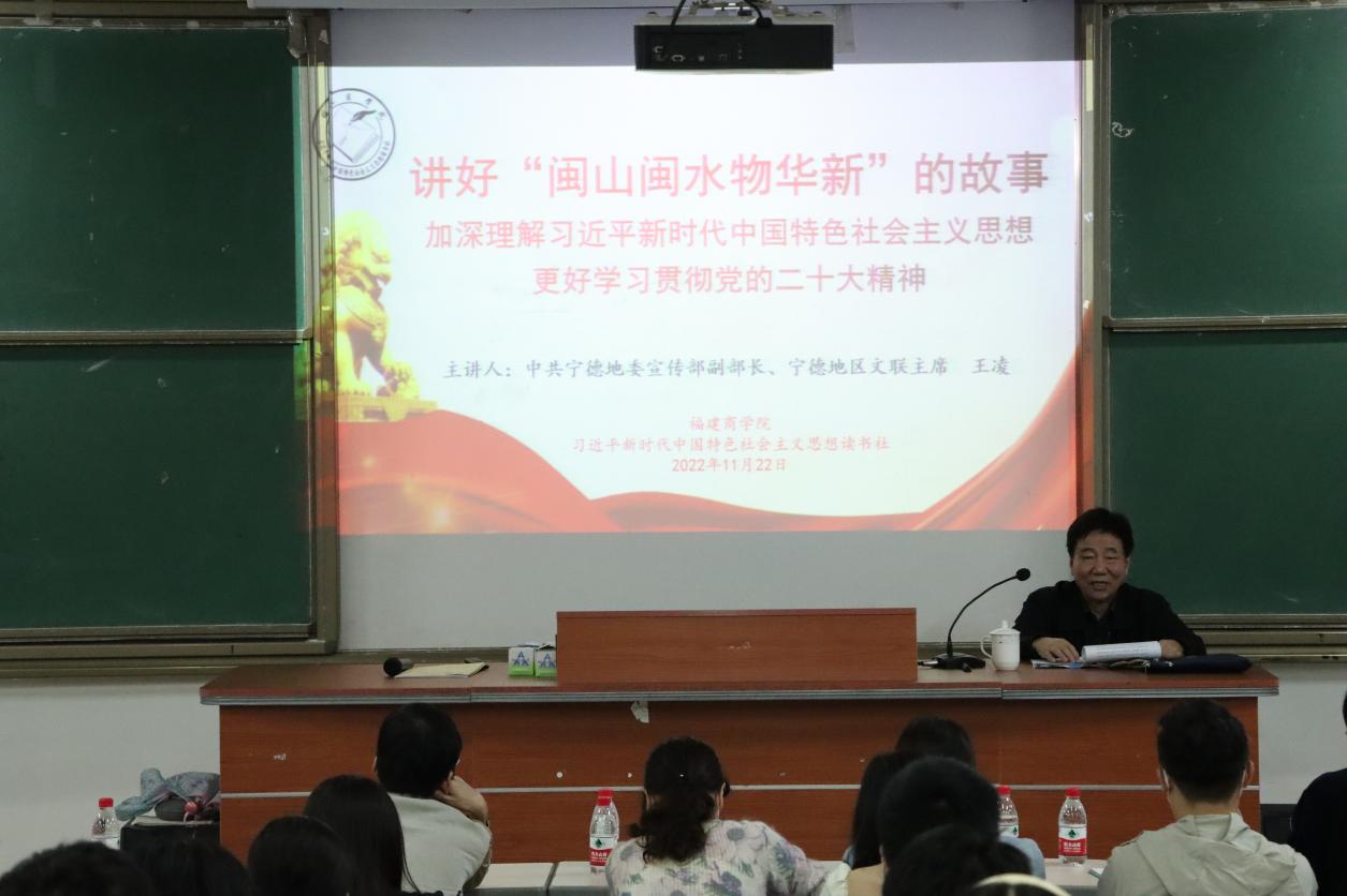 闽山闽水物华新,“习言习语”催人进。11月22日晚,中共宁德地委宣传部原副部长、原宁德地区文联主席王凌研究员受邀莅临必赢官网,为必赢官网师生作了题为《讲好“闽山闽水物华新”的故事,加深理解习近平新时代中国特色社会主义思想,更好学习贯彻党的二十大精神》的专题讲座。校党委副书记吴访益,马克思主义学院、机关党委负责同志,学校习近平新时代中国特色社会主义思想学生读书社、教职工读书社社员代表参加。