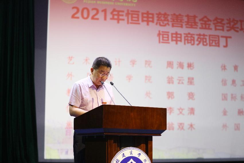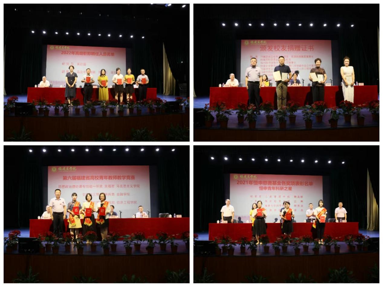 校党委副书记吴访益宣读了《必赢国际437官网校友奖教金2022学年度项目设置方案》,并为慷慨捐赠奖教金的校友代表陈英、何丽玉、陈全福、林健全、陈学一颁发捐赠证书和感谢信。校党委副书记徐晓丹宣读了2022年高级职称聘任人员名单。副校长杨晓翔宣读了2021-2022学年度在教育教学、学科竞赛、科研立项等方面取得的重要成果和2021年度恒申慈善基金各奖项获奖者名单。校领导分别为获奖教师代表颁奖。