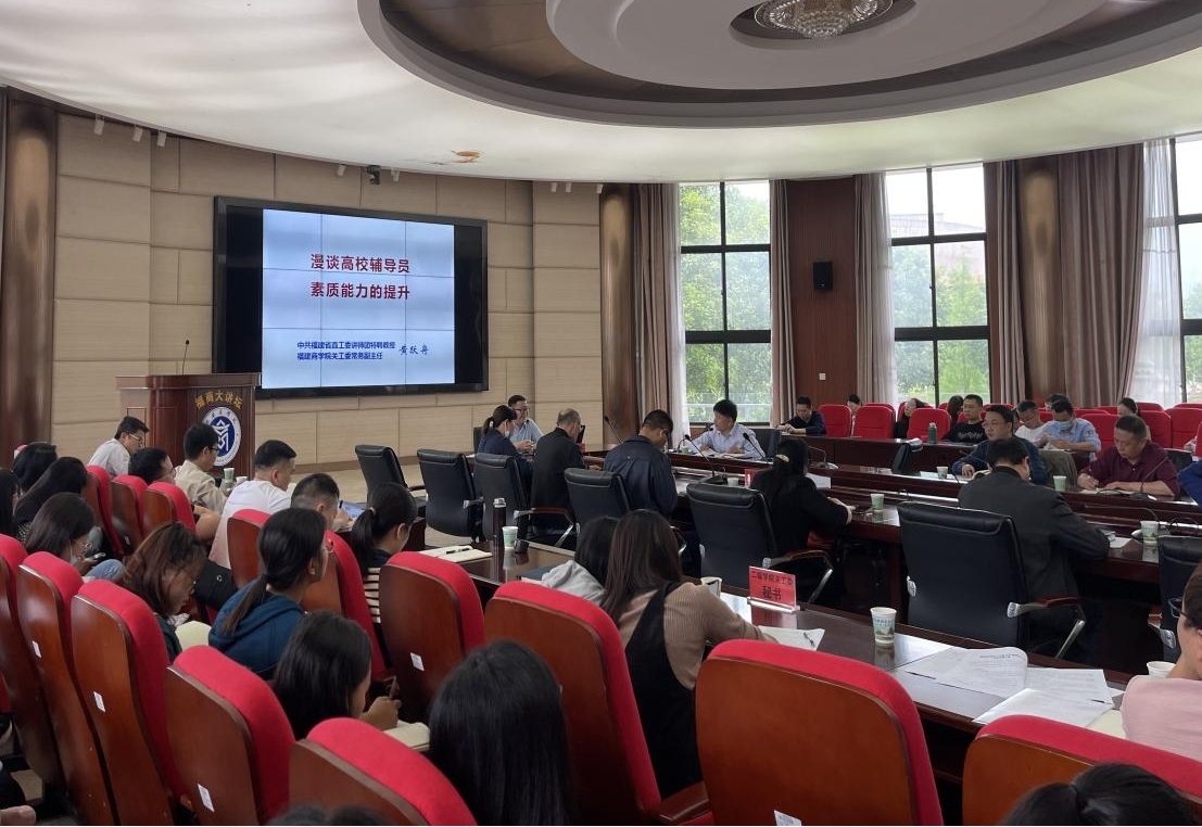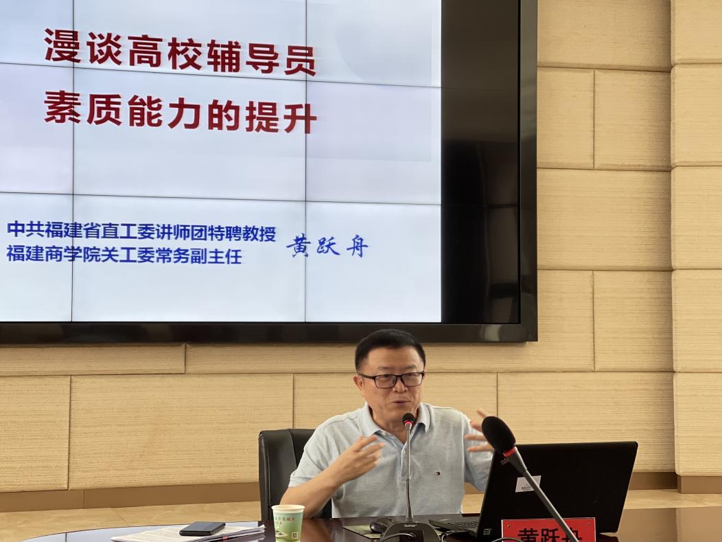 为提升辅导员的理论水平、职业能力和专业素养,必赢官网从4月起开始举办2022年辅导员系列提升课程。近日,第三讲课程由中共福建省直工委讲师团特聘教授、福建省首批“新时代宣讲师”黄跃舟在连江校区明德楼视频会议室开讲,本次讲座主题为“漫谈高校辅导员素质能力的提升”。讲座由学生工作部负责人主持,各二级学院党委副书记、辅导员、学生工作部有关人员近80人参加。