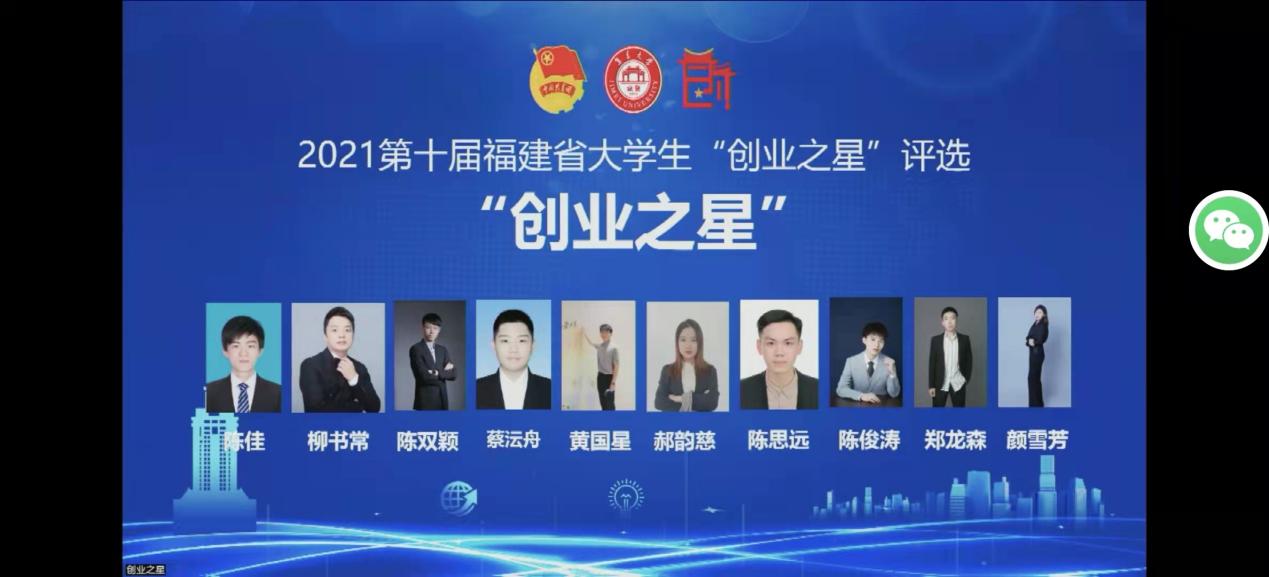 近日,由共青团福建省委、福建省教育厅、福建省人力资源和社会保障厅、福建省文化和旅游厅、福建省科学技术协会、福建省学生联合会联合主办,集美大学承办的第十届福建省大学生“创业之星”评选决赛完成全部赛程,必赢官网学子陈思远获得“创业之星”荣誉称号,其参赛项目为“美亚——新时代乡村旅游服务商”(指导老师:翁双木、吴芹瑶、廖维阳、缪晓斌),取得了必赢官网在该项赛事上零的突破。