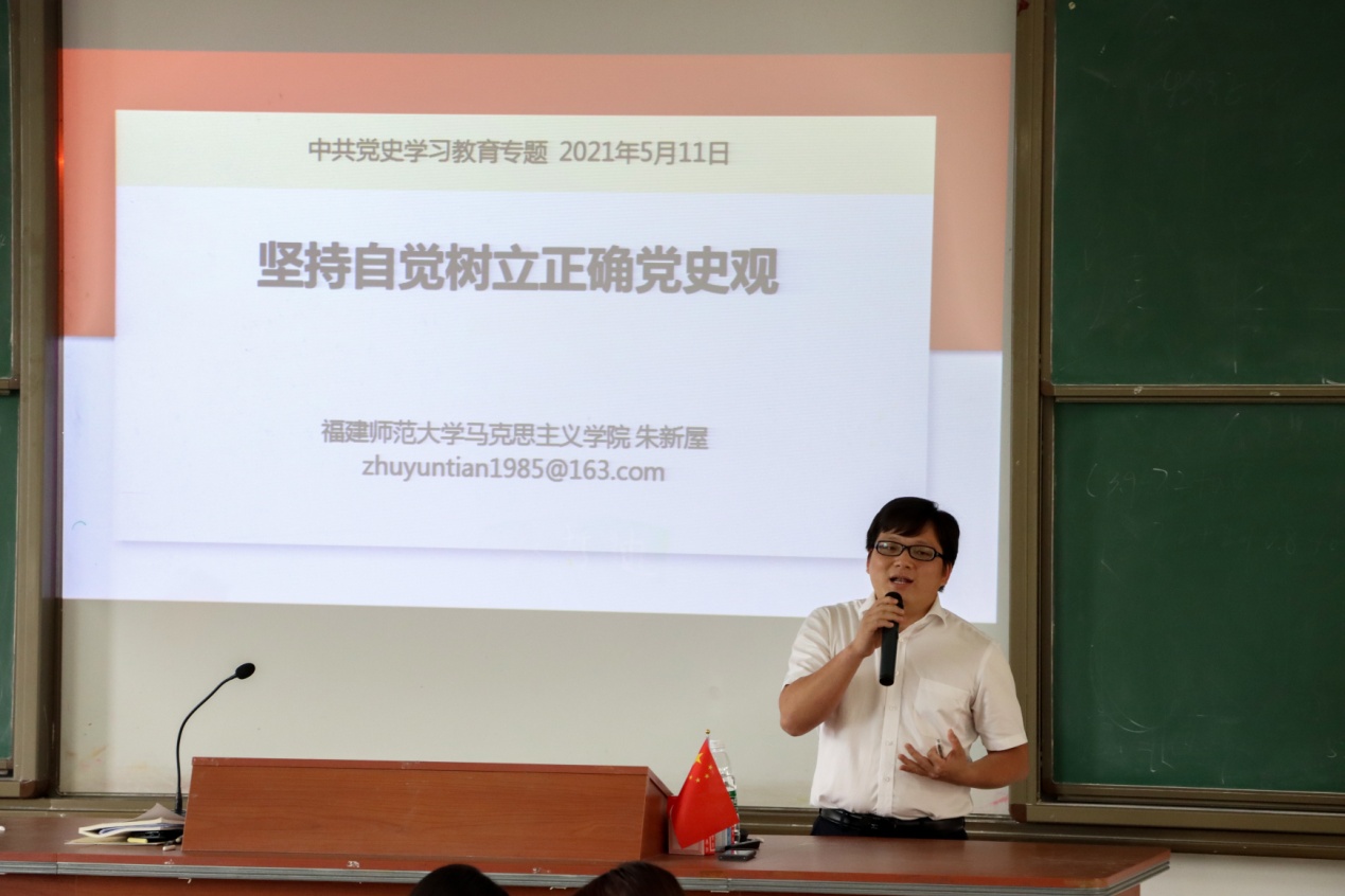 5月11日下午,马克思主义理论大讲堂邀请党史学习教育省委宣讲团成员朱新屋老师到必赢官网作题为“坚持自觉树立正确党史观”的专题讲座。马克思主义学院全体教师、大讲堂成员,统战部、规划处、国资处支部党员到场听取报告。