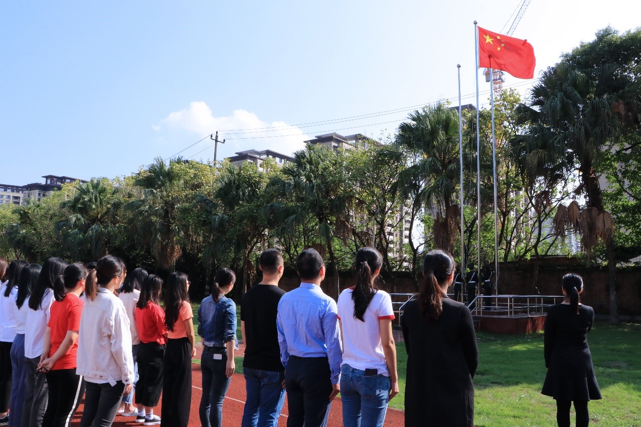 上午9时整,主持人宣布升国旗仪式开始,国旗护卫队在高昂的乐曲声中,迈着整齐划一、铿锵有力的步伐,昂首阔步护卫国旗到升旗台前。伴随着雄壮的《义勇军进行曲》,五星红旗冉冉升起,全体师生齐唱国歌,向国旗行注目礼,仪式庄严而神圣。这是对伟大祖国的深情热爱,是对革命先烈的崇敬和怀念,更是充满对新时代中国特色社会主义事业的坚定自信。2020年是新中国成立71周年,是全面建成小康社会决胜之年,是脱贫攻坚收官之年。2020年是特殊的一年,突如其来的新冠疫情席卷全国,在党的坚强领导和全国各族人民的共同努力下,疫情防控取得决定性胜利。在这举国欢庆的时刻,我们衷心祝愿伟大的祖国更加繁荣昌盛,各项事业不断取得新的成就,在新时代实现新跨越。