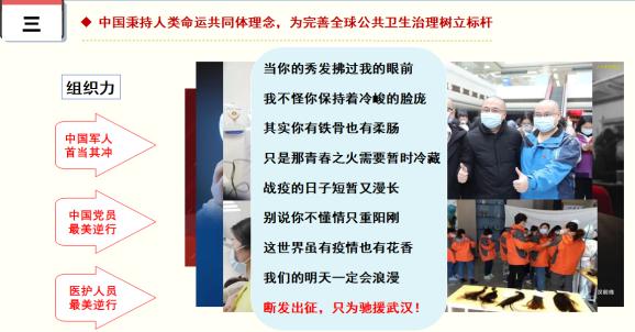 李金凤老师的《从中国抗疫看中国政治制度的优势》从全国人民齐心协力投入战“疫”、从火神山和雷神山的建设奇迹等着重阐释了在党的统一领导下集中力量办大事的政治制度优势。林胜平老师《党的领导是做好疫情防控工作的政治保障》从党的领导是战胜疫情的根本保证、强大引导力、关键所在、坚强后盾四方面论述了在党的集中统一领导下打赢疫情防控阻击战的信心和决心,最后阐明了办好中国的事情,解决中国的问题,关键在始终坚持党的领导。刘贤玲老师的《命运与共,共克时艰》以武汉封城、湖北封省为例,阐释了中国为阻止疫情扩散而敢于担负大国责任的胸怀;及时向全世界通报疫情信息、分享病毒基因序列、派遣医疗专家赴境外驰援等举措,更是彰显了中国对共建共享人类命运共同体的承诺与担当。陈火荣老师的《钢铁雄狮战江城,英雄本色见军威》把目光聚焦于人民子弟兵在疫情防控中一段段感天动地的故事、一幅幅令人热泪盈眶的画面,展示了中国人民解放军听党指挥、能打胜仗、作风优良的素质风貌。谢东俊老师的《疫情防控是一场人民战争》从“稳定民心”“汇聚民力”“汲取民智”三方面阐释了以习近平同志为核心的党中央面对疫情的肆虐,紧紧依靠人民,汇聚人民的力量,站在人民战争的高度谋划和科学部署,为后续打赢疫情防控攻坚战阻击战奠定了坚实的基础。