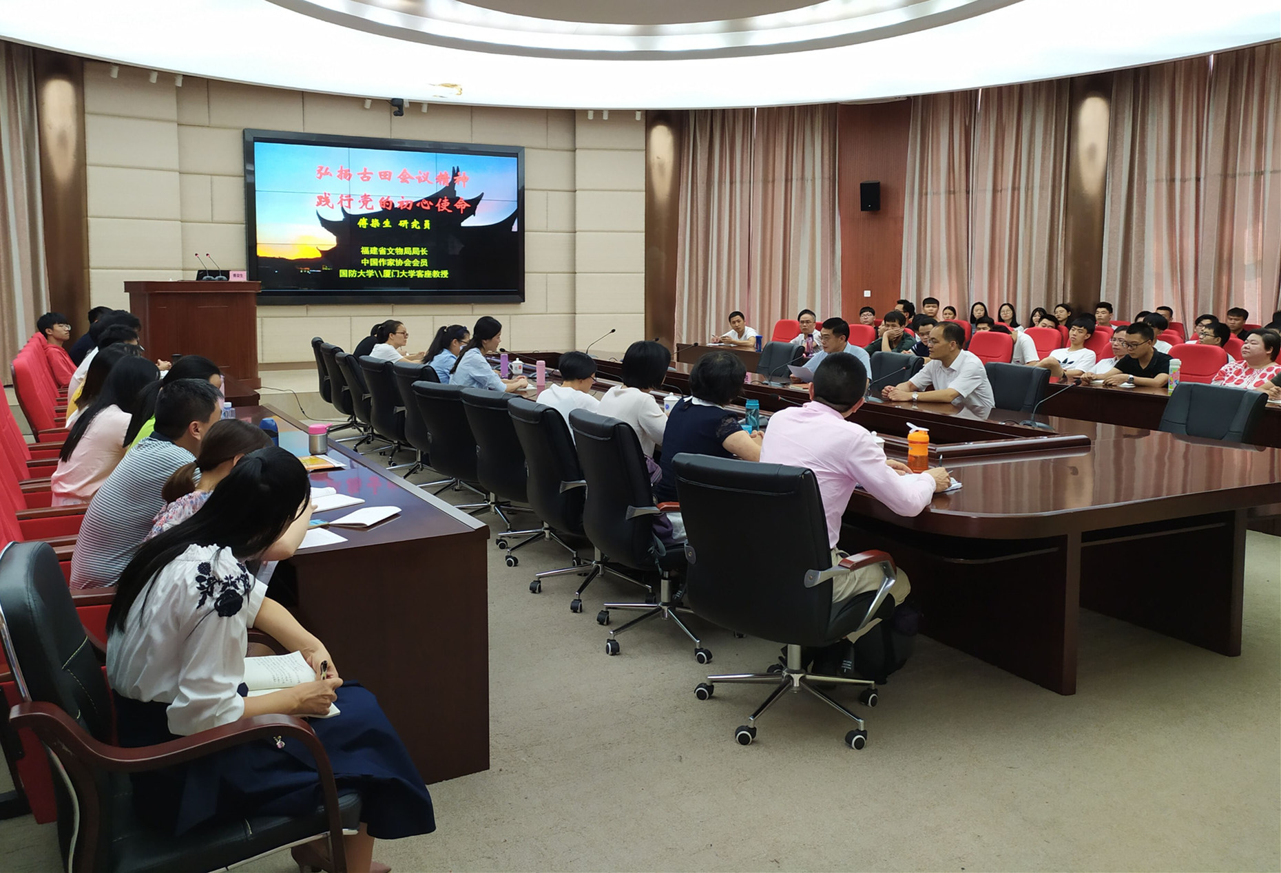 为引导党支部书记领悟初心使命,增强党的意识,坚定理想信念,培训班邀请省文旅厅党组成员、省文物局局长、国防大学、国防科大、厦门大学等大学兼职教授傅柒生作《弘扬古田会议精神,践行党的初心使命》专题讲座。傅柒生局长以大量史实为线索回顾了古田会议历史,并从“坚定理想信念、志存高远”“坚持解放思想、实事求是”“坚信星星之火、可以燎原”“坚守以人为本、忠诚为民”等方面阐述了共产党人的初心使命。让参训的党支部书记在历史的追忆和现实的实践中更加深刻地领悟并牢记习近平总书记的谆谆教诲:“我们当初是从哪里出发的?为什么出发的?”