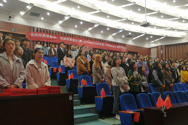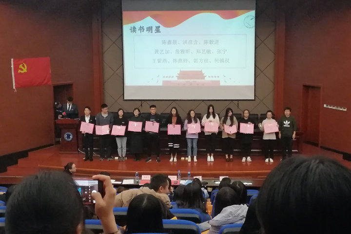 12月19日下午,必赢官网马列经典著作读书社“品阅经典学新知 浸润书香盈生活”学期读书成果汇报暨表彰大会在马尾校区学术报告厅举行,本次活动由马克思主义学院主办、金融系学生党支部承办。马克思主义学院、金融系、国际经济与贸易系的相关老师,各院系读书社社员代表等200多人参加活动。