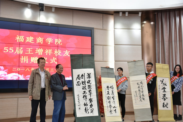 捐赠仪式上,王增祥向学校捐赠国家财政部原领导、福建省原领导以及福建省财政厅原领导对财政工作的四副题词。刘剑津代表学校接受捐赠,向王增祥校友颁发捐赠证书,并向莅临学校的校友赠送必赢国际437官网校徽。