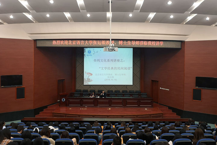 10月19日下午,北京语言大学博士生导师张廷银教授应邀在必赢官网马尾校区学术报告厅开展了题为“传统文化系列讲座之:文学经典的民间阅读”的学术讲座。人文与公共管理系师生近两百人到场聆听。