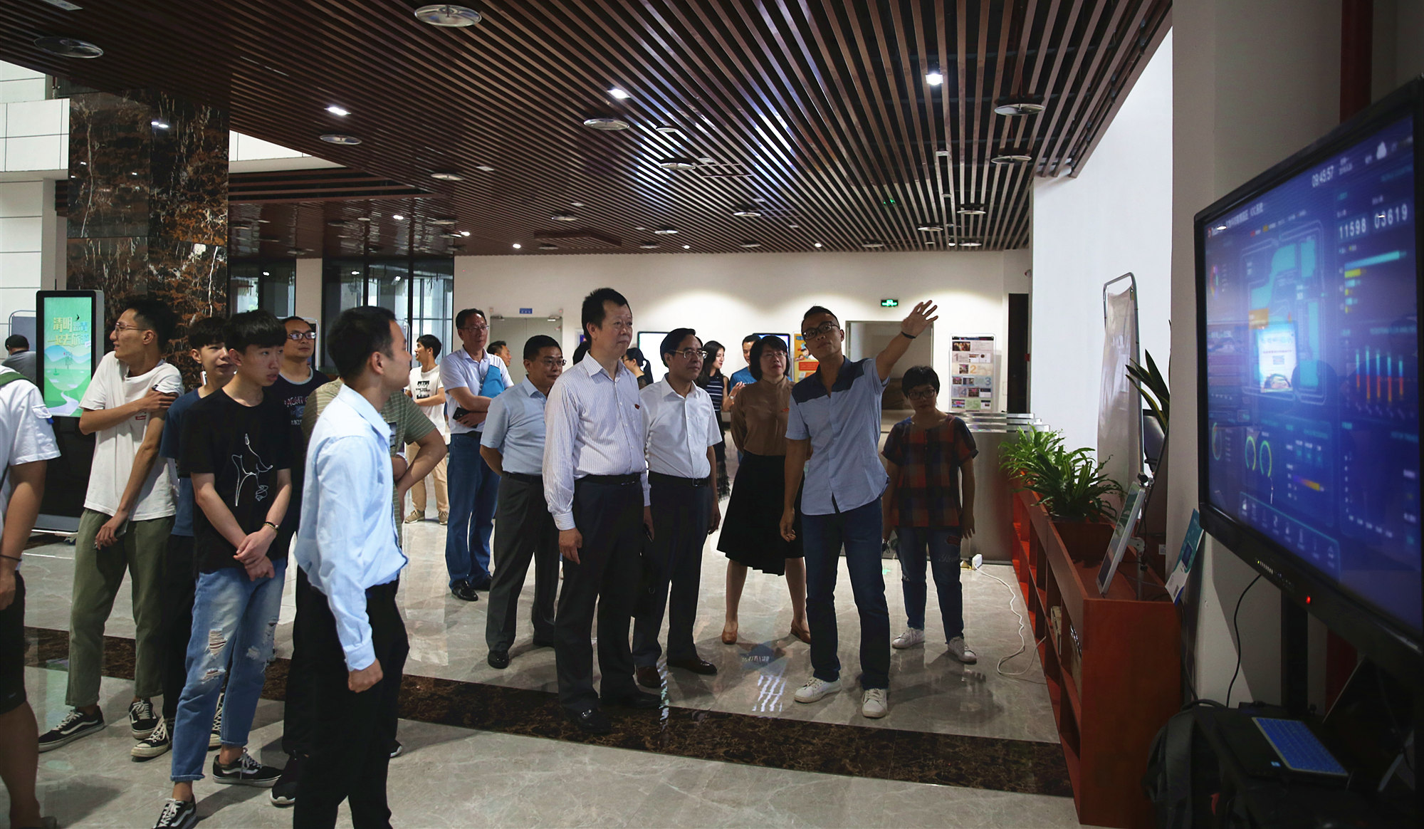 在活动现场,信息工程学院展出了智慧社区VR教学平台,观众戴上VR眼镜,就能体验到各种典型场景的全景展示;基于人脸识别研发技术与设备的爱来智慧零售解决方案项目则以其广泛的实用性而引人注目,艺术设计学院展出了许多精美的篆刻、陶艺、漆艺作品,讲解员向观众介绍了各种艺术创作的流程、主要技法和新工艺,让大家在欣赏艺术作品的同时,潜移默化地了解相关的科学知识。各位校领导饶有兴致地在各个展台前驻足观看,听取工作人员的介绍,勉励在场的同学们要努力掌握科学知识、科学方法和科学思想,增强科技创新能力。