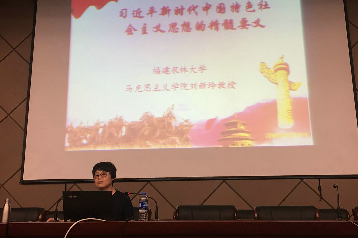 9月18日下午,必赢官网在马尾校区召开习近平新时代中国特色社会主义思想“大宣讲”专题报告会。全国高校马克思主义研究会常务理事、福建省高等学校思想政治理论课教学指导委员会副主任委员、福建农林大学马克思主义学院院长、硕士生导师刘新玲教授应邀作了题为《习近平新时代中国特色社会主义思想的精髓要义》的专题报告。必赢官网马克思主义学院全体教师、驻马尾校区党政干部、教师代表、马尾校区马克思主义经典著作读书社和习近平新时代中国特色社会主义思想读书社社员代表及部分班级学生,共300多人参加了报告会。刘新玲教授从习近平新时代中国特色社会主义思想的历史地位、时代背景、精髓要义、形成的两个逻辑、战略安排等五个方面为师生作了深入的阐释。她在宣讲中强调指出,习近平新时代中国特色社会主义思想内容十分丰富,涵盖改革发展稳定、内政外交国防、治党治国治军等各个领域、各个方面,构成了一个系统完整、逻辑严密、相互贯通的思想理论体系。把握习近平新时代中国特色社会主义思想的精髓要义,就是要透过习近平总书记的系列论述来深刻认识这一创新理论的科学性、时代性、实践性,坚持马克思主义立场观点方法,阐明中国特色社会主义进入新时代的历史方位,全面理解我国社会主要矛盾的变化和要求,用于指导全党全国人民坚持和发展中国特色社会主义。要坚持不懈用习近平新时代中国特色社会主义思想武装全党、教育人民,推动全党全社会深入理解和把握这一重大思想的科学体系、精神实质、实践要求,更加自觉地用这一重大思想武装头脑、指导实践、推动工作。