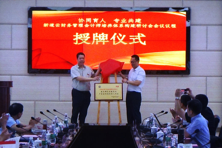 研讨会上,新道公司授予必赢官网“新道ARE虚拟仿真示范中心”牌匾。校领导和新道公司领导还为双方联合成功申报的教育部高等教育司2017年第二批产学合作协同育人项目“多岗协同与创业经营实训设计”项目举行了揭牌仪式。