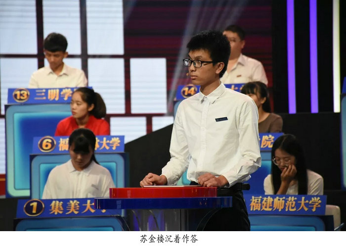 苏金楼同学在此前的比赛中,憾失前五张决赛入场券。在23日下午的决赛中,他首先作为20人竞答团选手进入比赛,并以29分的成绩在竞答团中脱颖而出,获得最后一张决赛入场券,与来自此前已进入决赛的福州大学、福建农林大学、三明学院的选手展开最后的角逐。