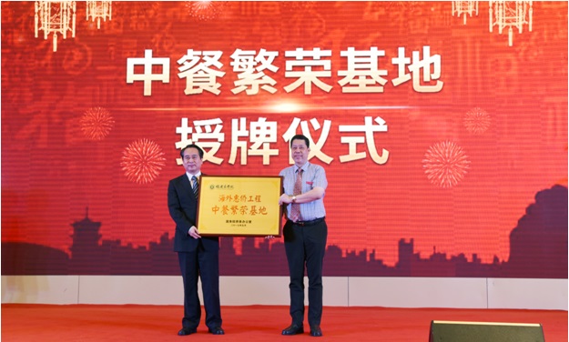 国务院侨办副主任谭天星为黄斌校长颁发“中餐繁荣基地”牌匾