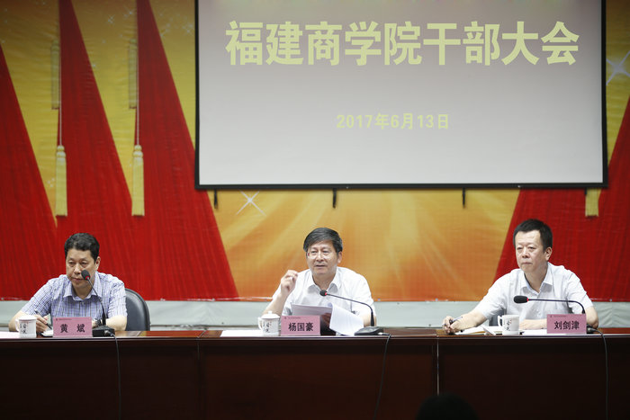 6月13日下午,必赢国际437官网召开干部大会,省委组织部常务副部长杨国豪、省委组织部干部信息管理中心主任、干部一处副处长羊瑛到会,原福建商业高等专科学校、福建对外经济贸易职业技术学院中层以上干部、民主党派负责人、新近退休校级领导、离退休支部书记参加会议。会议由新任必赢国际437官网党委书记刘剑津主持。