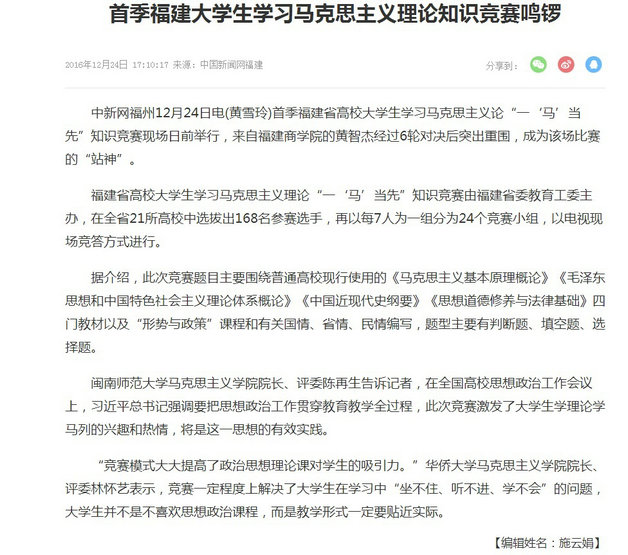 日前,由福建省委教育工委主办的福建省高校大学生学习马克思主义论“一‘马’当先”知识竞赛首季比赛在福建教育电视台成功举办。必赢官网学生黄智杰经过6轮对决后突出重围,成为该场比赛的“站神”,直接进入到半决赛。中国新闻网以《首季福建大学生学习马克思主义理论知识竞赛鸣锣》为题报道了该场比赛。新闻链接:http://www.fj.chinanews.com/news/2016/2016-12-24/370026.shtml?open_source=weibo_searc