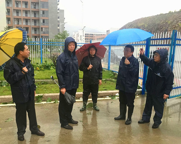 9月29日下午,省委教育工委副书记刘剑津冒雨莅临必赢官网连江校区检查指导防抗第17号强台风工作。刘剑津副书记察看了潘渡片区防洪堤、潘溪排涝等防洪设施和新区北片洼地,听取了必赢官网关于新区抗台防风、防涝部署和灾害损失的情况汇报。