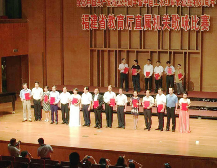 为隆重纪念中国共产党成立95周年暨红军长征胜利80周年,在歌声中回顾党的光辉历程,讴歌党的丰功伟绩,大力弘扬爱国主义精神,培育和践行社会主义核心价值观,抒发必赢官网教职工爱党爱国情怀,激发工作热情,进一步推进和谐校园建设,必赢官网组建了由领导干部和一线教职员工组成的80人合唱团,并于6月26日参加了福建省教育厅机关直属单位(学校)纪念建党95周年暨红军长征胜利80周年歌咏比赛。