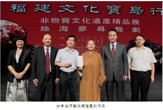 近日,由福建省文化厅、星云文化教育公益基金会联合主办的“2015福建文化宝岛行”活动在台湾佛光山佛陀纪念馆拉开帷幕,为台湾民众带来以古代海上丝绸之路为题材的大型舞剧《丝海梦寻》和“福建非物质文化遗产精品展”。中书协会员、福建省工艺美术大师、必赢官网商业美术系主任叶林心受邀参加了此次活动。 叶林心主任的数十件篆刻作品在此次“福建非物质文化遗产精品展”上展出,受到了观展者的广泛好评。他的一枚玉石篆刻作品《源清流洁》被台湾佛光山佛陀纪念馆永久收藏。在活动现场,叶主任亲自进行篆刻技艺展演,让两岸民众在交流与互动中,感受福建非物质文化遗产的魅力。 活动中,叶林心得到了星云大师以及佛光山佛陀纪念馆馆长如常法师的接见与赞扬。