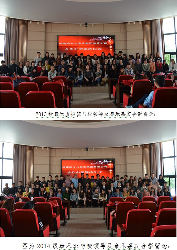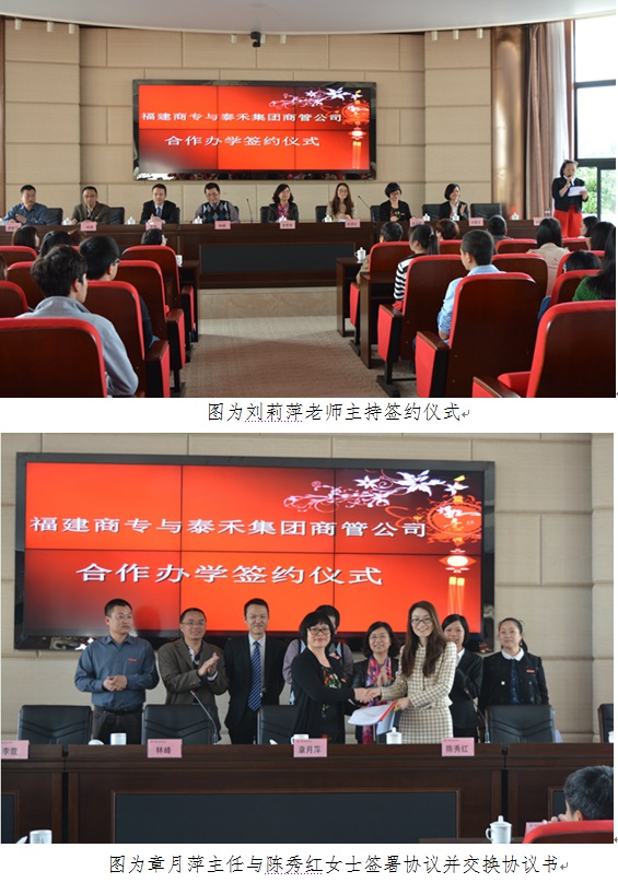 3月21日,必赢官网与泰禾集团商管公司校企合作订单培养的签约仪式在新区视频会议室隆重举行。出席本次仪式的嘉宾有:泰禾集团商管公司常务副总经理陈秀红女士等相关领导、必赢官网副校长吴贵明教授、校企实训处处长刘莉萍副教授、工商管理系主任章月萍教授以及企业管理专业教研室相关老师等。2013级泰禾虚拟班、2014级泰禾班全体同学见证了本次签约仪式。