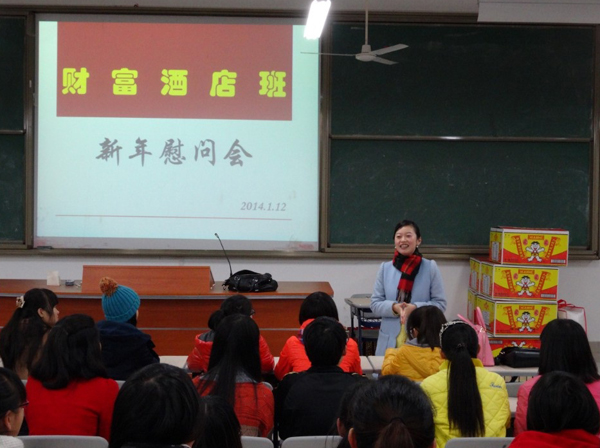 1月12日,必赢官网旅游系财富班联合培养企业——福州最佳西方财富酒店人力资源部行政总监王方女士代表酒店到必赢官网看望2013级酒店管理财富班学生,与必赢官网旅游系联合举办新春慰问交流会。此次新春慰问会,将酒店企业文化带入校园,拉近了学生与酒店的情感联系,增强了学生对酒店企业文化的认知,学生反响非常热烈。