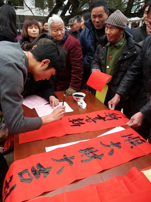 活动现场,数十名志愿者挥毫泼墨,大显身手,为村民们写下了一幅幅充满喜庆和祝福的对联,同时也将他们娴熟的书写技能,展现得淋漓尽致。在持续近3个小时的活动中,志愿者们书写春联数百对,拿到春联的村民脸上洋溢着喜悦的笑容。