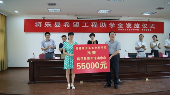 福建商专非常重视将乐县青年活动中心的建设,在学校新校区建设资金极其紧张的情况下,学校决定挤出资金55000元,资助将乐县11个乡镇建设青年活动中心,民盟福建商专支部和信息管理工程系总支也开展点对点对接,联合筹资5000元捐建1个青年活动中心。2012年7月16日,将乐团县委为此特意举办了捐建仪式,该项目的实施,对将乐县团的基层组织建设桥头堡推向乡镇一级的具体实践提供了资金保障,对乡镇青年活动中心建设模式也是一个有宜的探索。