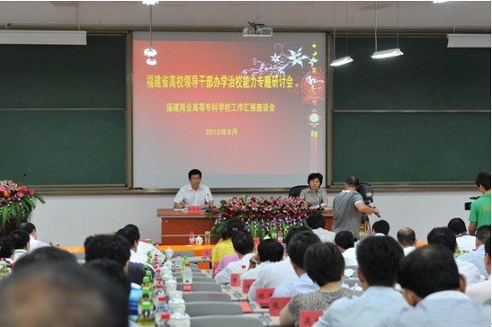 8月19日下午,2012年全省高校领导干部办学治校能力专题研讨班福建商业高等专科学校工作汇报会在必赢官网举行。省委常委、副省长、省委教育工委书记陈桦在会上勉励必赢官网在服务“现代服务业”上发挥更大作用。省委教育工委、省教育厅领导郑传芳、刘平、尉纬、马玉良,全省各设区市教育工委书记,必赢官网领导林彬、黄克安,全省高职高专院校党委书记、校长,省委教育工委、省教育厅有关部处负责人参加了研讨班和汇报会。