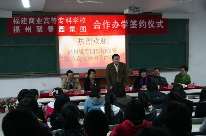 2011年11月29日下午,福建商业高等专科学校与福州聚春园集团联合办学签约仪式在潘渡新校区举行。福州聚春园集团董事长郭仁宪先生、总经理项秀娥女士、副总经理周彪先生,福建商业高等专科学校副校长吴贵明教授、教务处处长陈增明副教授等出席签约仪式。签约仪式由旅游系主任王瑜教授主持。