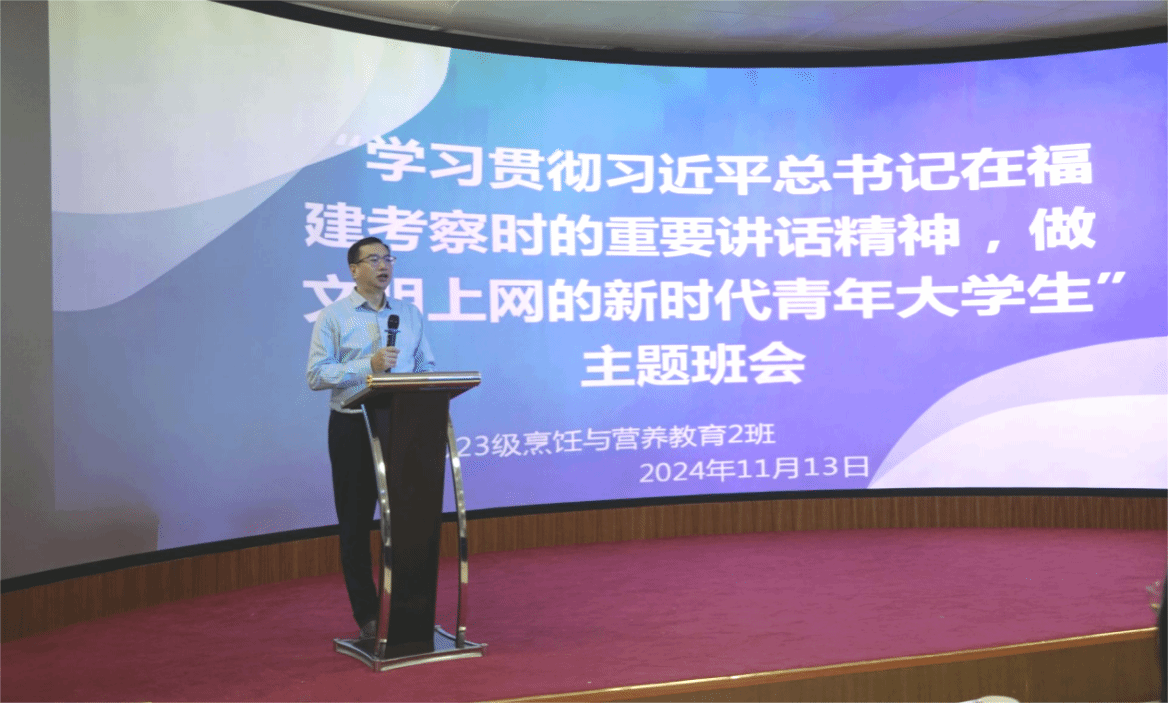 校党委副书记蒲文庆参加了2023级烹饪与营养教育2班、2023级数据科学与大数据技术1班的主题班会,与同学们亲切交流,希望同学们要认真学习领会习近平总书记在福建考察时的重要讲话精神,弘扬社会主义核心价值观;提升网络文明素养,依法上网、文明上网、安全上网、自律上网,营造积极健康和谐的网络环境。
