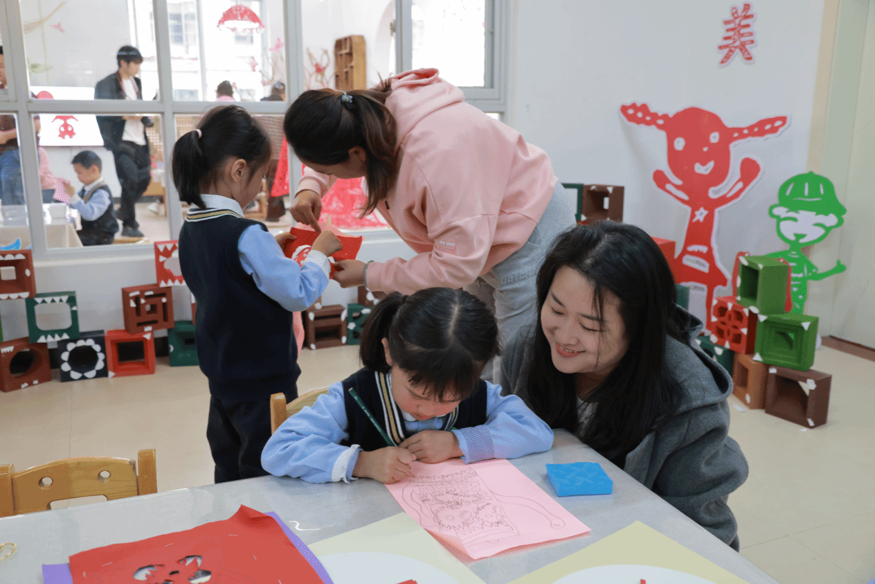 柘荣县第一幼儿园老师教授孩子们剪纸