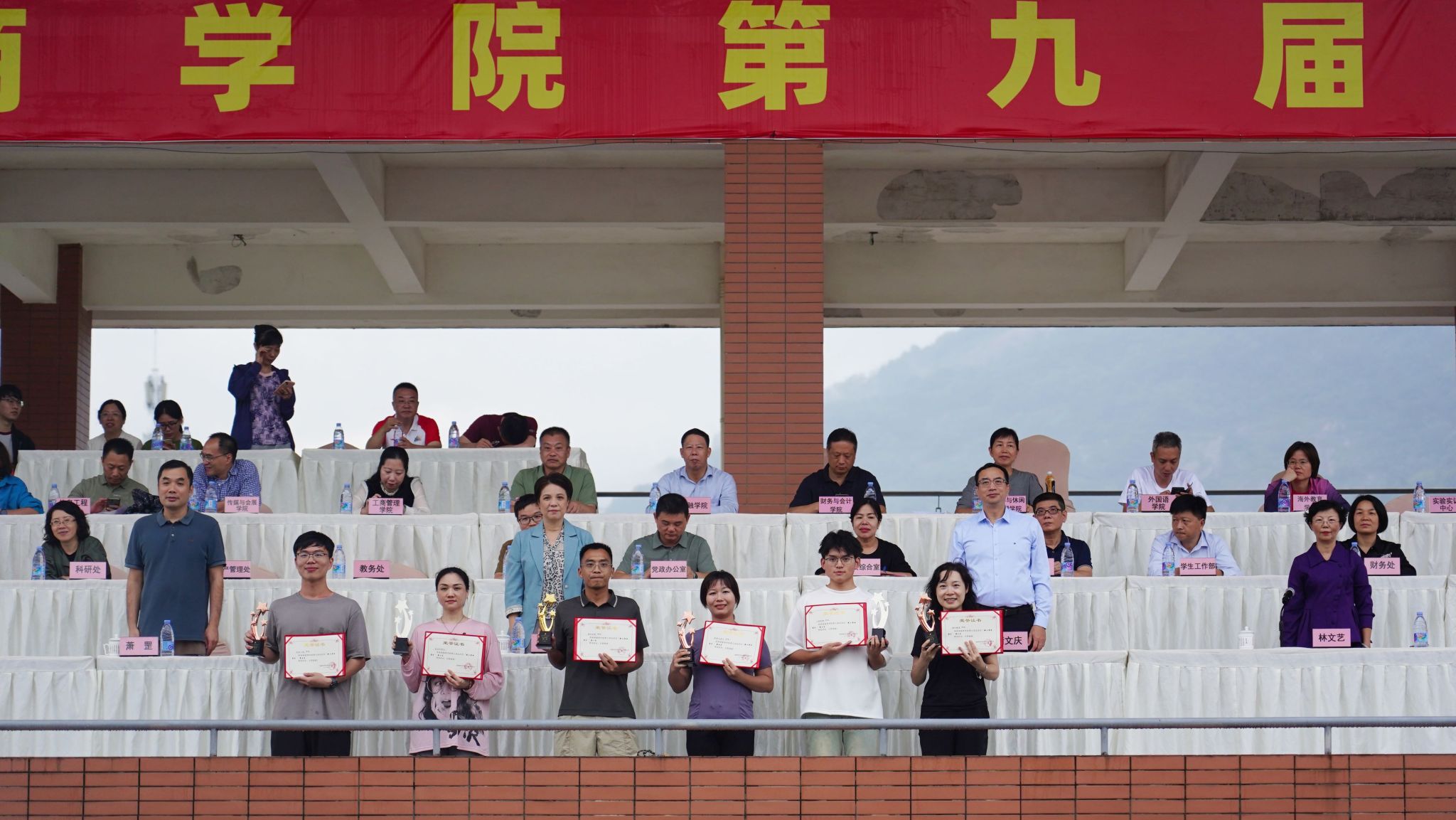 副校长萧罡宣布荣获第九届校运动会入场式表演前十名代表队名单、团体操表演前十名代表队名单、学生个人体育道德风尚获奖名单、教师个人体育道德风尚获奖名单、集体体育道德风尚奖前五名代表队名单以及最佳组织奖代表队名单,总裁判长、体育教学部负责人宣布学生组比赛团体总分前六名代表队名单和教工组比赛团体总分前六名代表队名单。现场还举行了颁奖仪式。