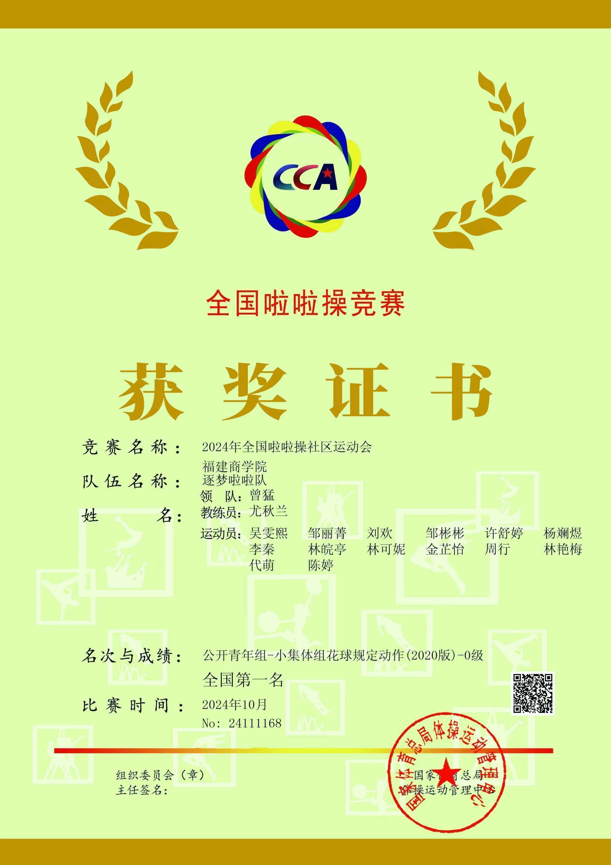 近日,由国家体育总局体操运动管理中心、中国蹦床与技巧协会主办的“2024年全国啦啦操社区运动会”圆满落幕。必赢官网代表队(教练:尤秋兰)积极备战,在公开青年组小集体花球规定动作-0级比赛中,获得全国第一名的佳绩(同组别26支参赛队伍);在花球校园啦啦操示范套路比赛中获得全国第四名(同组别90支参赛队伍)。
