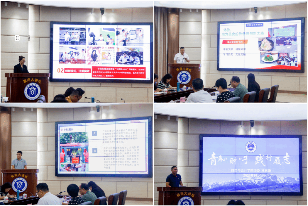 汇报会上,各学院以PPT形式从组队情况、实践内容、实践成效、社会影响力等角度,围绕爱国主义教育实践、中华文化传承、基层服务践行、乡村振兴促进、民族团结实践等方面进行汇报。