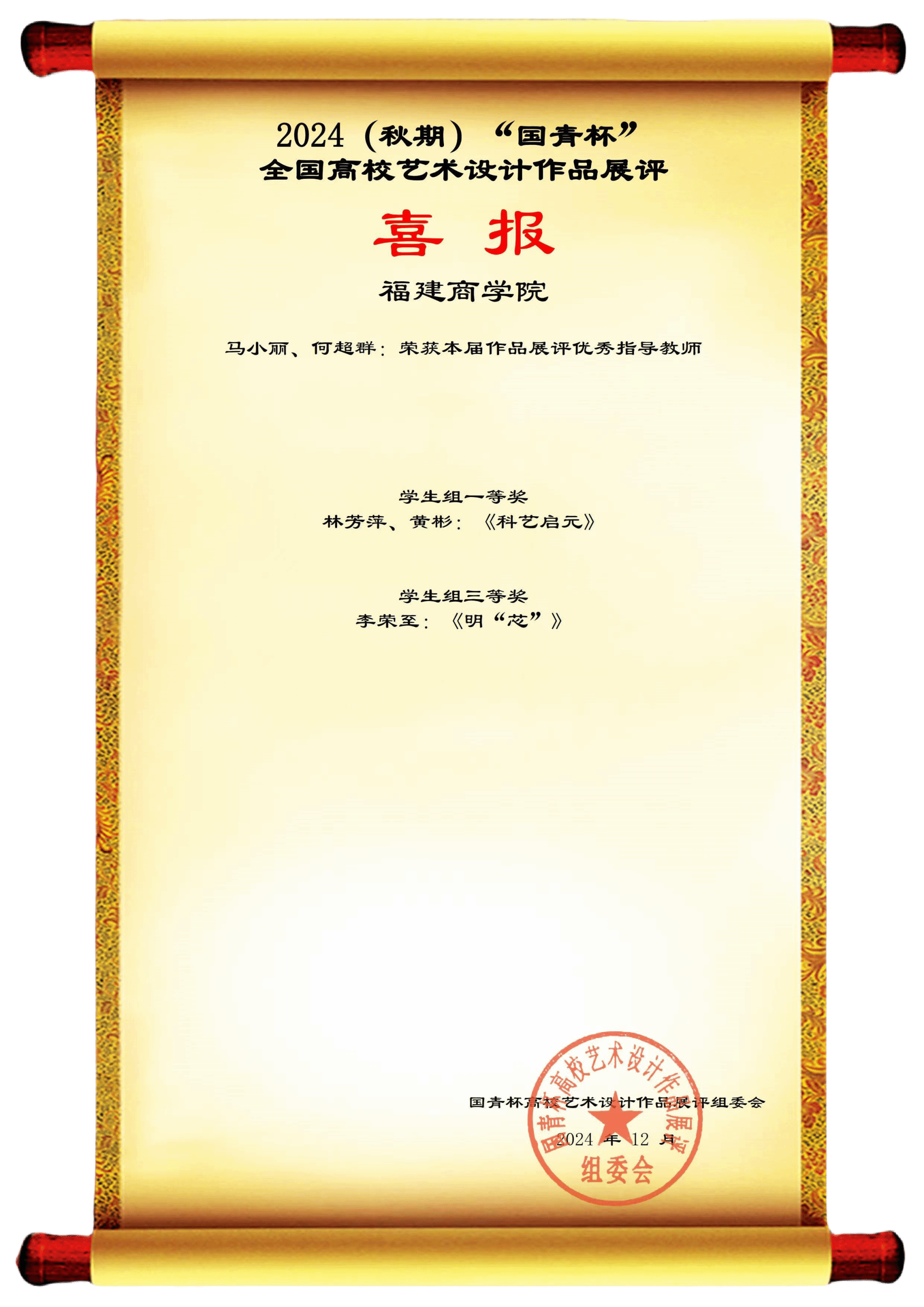 近日,由全国高校艺术设计作品大赛组委会主办的2024年“国青杯”全国高校艺术设计作品大赛圆满结束。必赢官网传媒与会展学院学生平面设计类作品在此次大赛中荣获一等奖1项、三等奖1项。马小丽、何超群两位老师荣获评本届作品展评优秀指导老师。具体获奖情况如下: