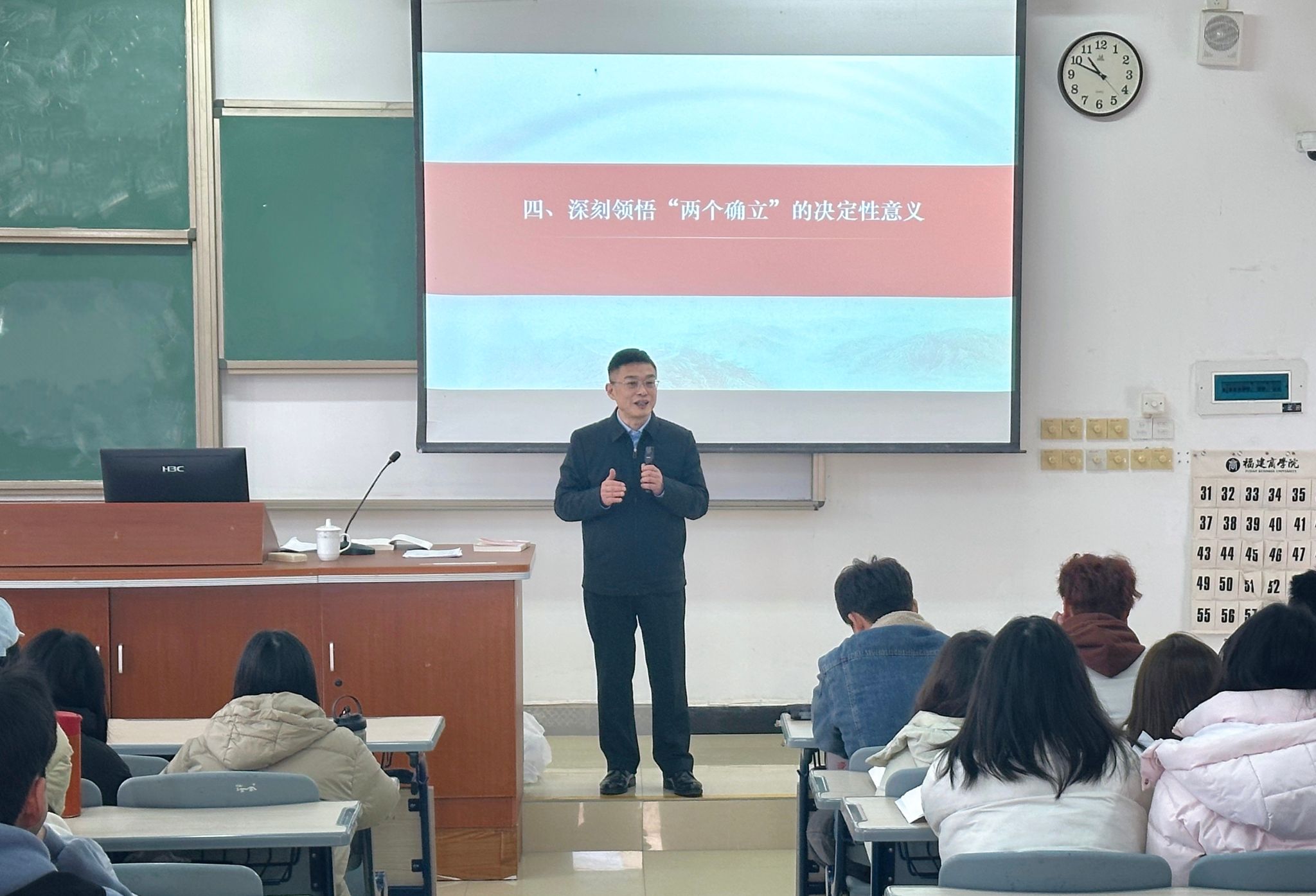 在《习近平新时代中国特色社会主义思想概论》课上,吴访益重点围绕“马克思主义中国化时代化新的飞跃”,运用启发式教学,带领同学们主动思考、积极发言,深入浅出地讲解了习近平新时代中国特色社会主义思想创立的时代背景、主要内容、历史地位和指导意义等内容,引导同学们进一步全面学习领会习近平新时代中国特色社会主义思想,进一步全面准确把握习近平新时代中国特色社会主义思想的世界观、方法论,牢牢把握“六个必须坚持”,引导同学们从中汲取踔厉奋发、勇毅前行的精神动力,坚定历史自信、锤炼斗争本领,提高分析问题、解决问题的能力,引导同学们不断增进对党的创新理论的政治认同、思想认同、理论认同、情感认同。