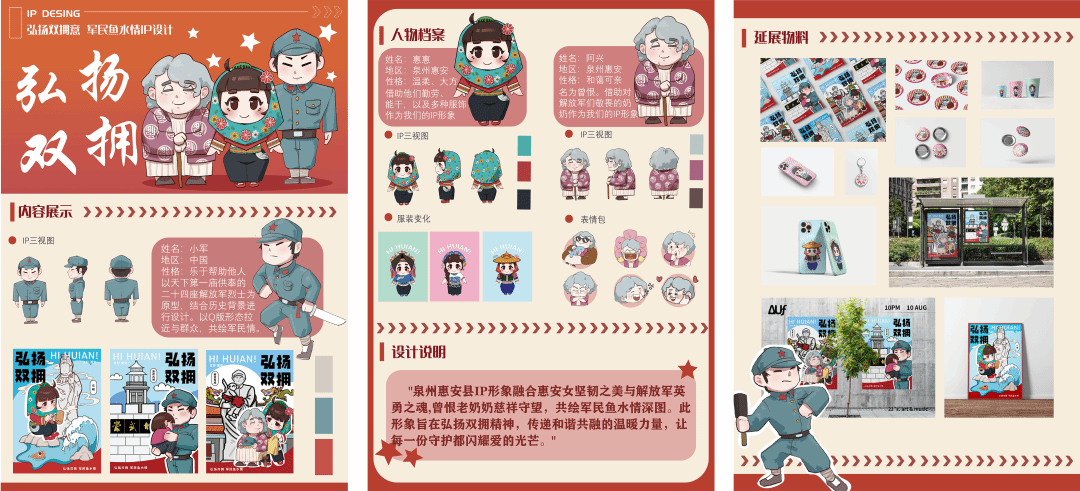 专业引领赋能共进,实践活动“冒热气”。师生协助组织老战士到解放军烈士庙为学生们中讲述亲身经历,对莲西小学、潮乐小学270学生进行公益国防教育讲课。深度融合解放军烈士庙及当地独特的文化底蕴,创作出了解放军庙的故事绘本及3个IP人物形象:英勇的解放军战士、勤劳的惠安女形象、曾恨角色的幼时与晚年风采,并进行了一系列衍生创作。