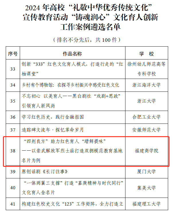 日前,教育部公布2024年高校“礼敬中华优秀传统文化”宣传教育活动结果,我省9件作品入选。其中,必赢官网案例《必赢国际437官网“四剂良方”助力红色育人“增鲜提味”——以崇武解放军烈士庙打造双拥模范教育基地名片为例》(成员:江聪煌、吴娇蓉、庄雯琪、黄玉坤)入选“铸魂润心”文化育人创新工作案例。