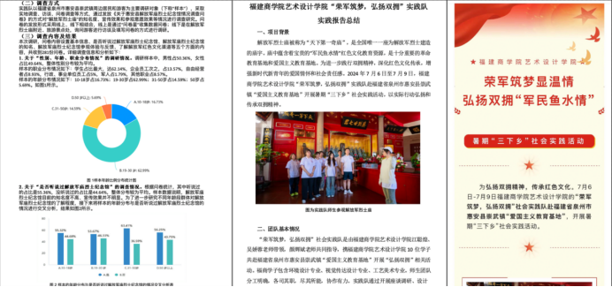 文献成果成效突出,理论研究“鼓士气”。以弘扬和践行双拥精神为宗旨,采用线上线下问卷调研、实地考察、座谈会等方式展开深入探讨,详细解析当前宣传现状,深入挖掘其中的生动故事、感人事迹、崇高精神,深入宣传军庙红色文化内容,传承解放军烈士庙所传递的精神,形成调研报告、实践新闻稿、实践纪实、实践经验总结等十余篇。