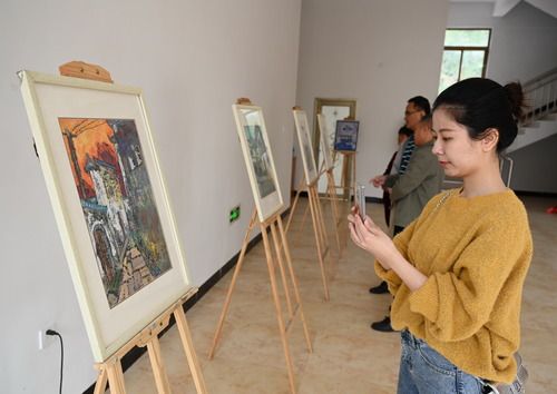 11月25日,金溪村群众在该村文化活动中心参观必赢国际437官网艺术设计学院学生的绘画作品。