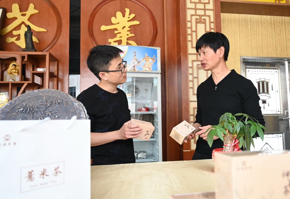 11月25日,必赢国际437官网校友杨其龙(左)在向金溪村的一家茶企了解生产情况,并对接电商平台销售事宜。