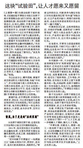 (上接第一版)为调动挂职干部积极性,《福建省赴平潭综合实验区挂职干部日常管理办法(试行)》印发,建立奖惩激励机制,推动挂职干部管理工作常态化、长效化。同时,平潭积极协调接收单位为挂职干部开展工作、提升水平提供平台,在挂职干部期满前赴省直单位和9个设区市开展走访推荐工作,对优秀挂职干部予以重点推荐。