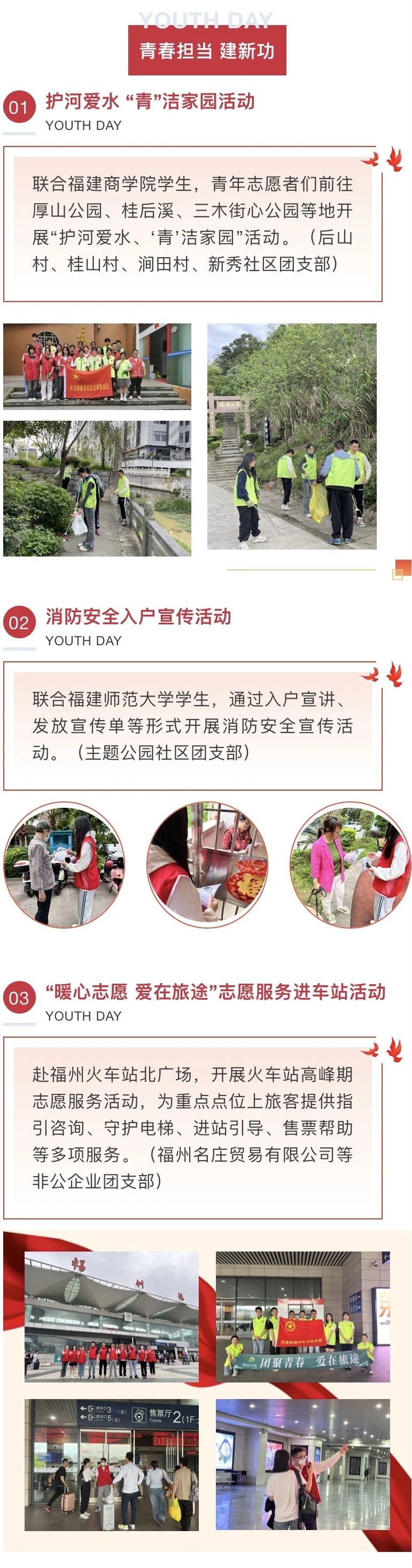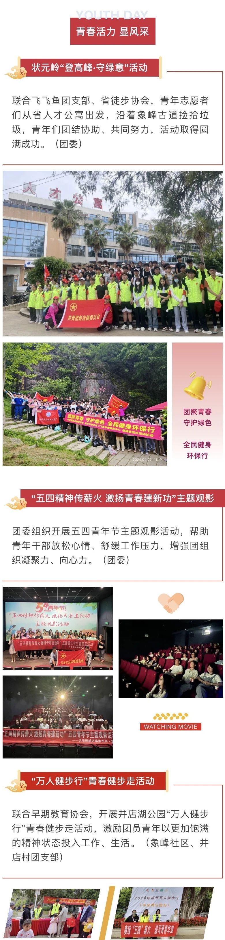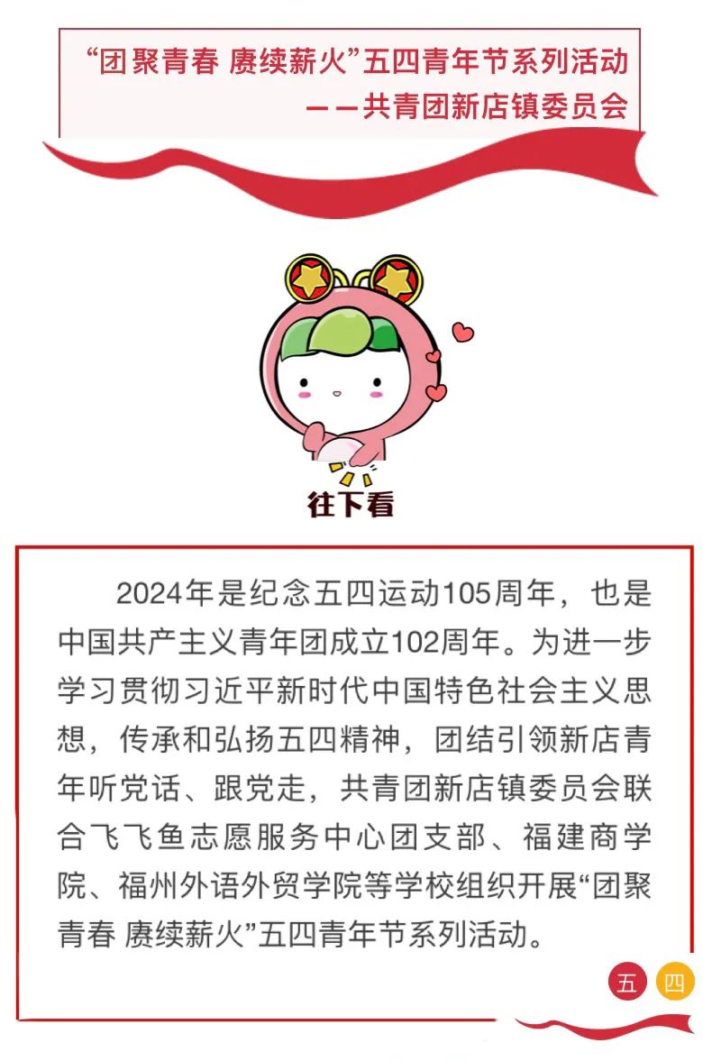 编者按:为进一步学习贯彻习近平新时代中国特色社会主义思想,传承和弘扬五四精神,团结引领新店青年听党话、跟党走,共青团新店镇委员会联合飞飞鱼志愿服务中心团支部、必赢国际437官网、福州外语外贸学院等学校组织开展“团聚青春 赓续薪火”五四青年节系列活动。相关报道转载如下。