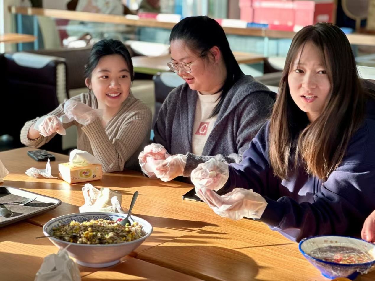 会后,师生代表齐聚学校食堂二楼体验包饺子。师生齐动手,飘香情谊长,玉米荠菜馅、猪肉香菇馅…月牙饺、麦穗饺、元宝……师生们卷起衣袖,配合默契。形状各异、个性鲜明的饺子,一盘接着一盘新鲜出炉。