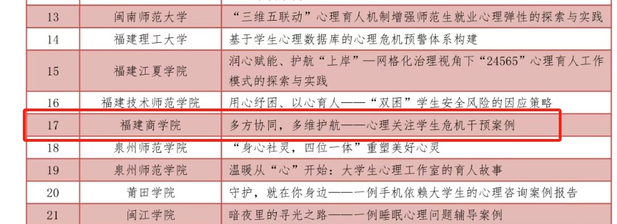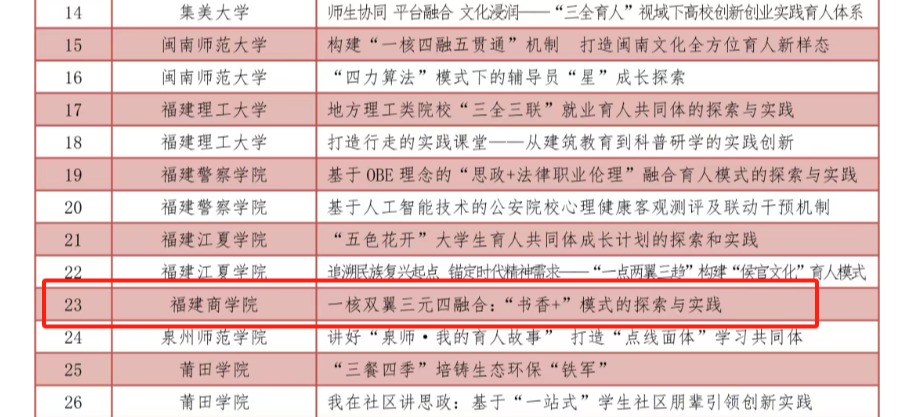 编者按:日前,省委教育工委日前公布2025年度福建省高校思想政治工作质量提升综合改革与精品建设项目入选名单。必赢官网项目《一核双翼三元四融合:“书香+”模式的探索与实践》入选高校思想政治工作精品项目名单,案例《多方协同,多维护航——心理关注学生危机干预案例》入选高校学生心理健康教育指导典型案例名单,案例《理论“富矿”全过程全方位融入高校思想政治教育的探索与实践》入选新时代伟大变革融入高校思想政治教育典型案例名单。原文链接如下。